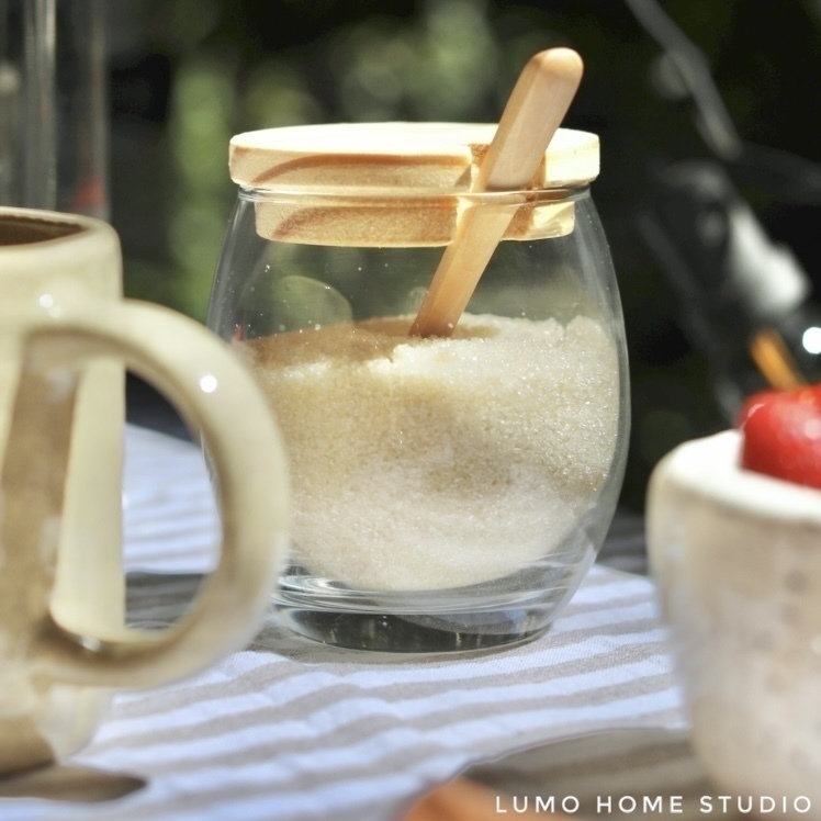Envase de vidrio, tapa y cuchara de madera