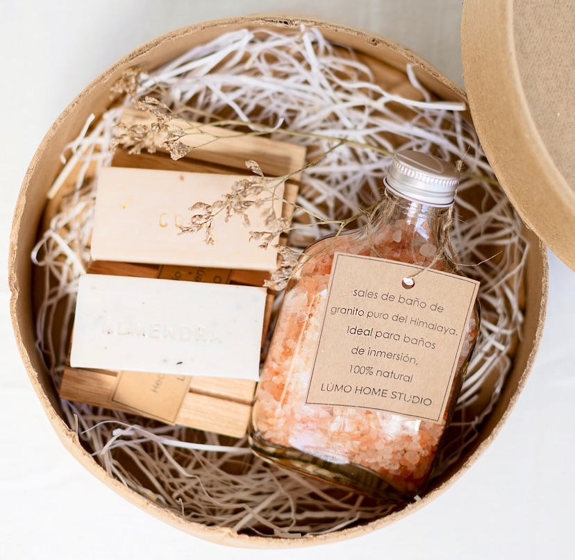 . 200 cc de sales de baño naturales, presentadas en envase de vidrio con tapa a rosca metálica.