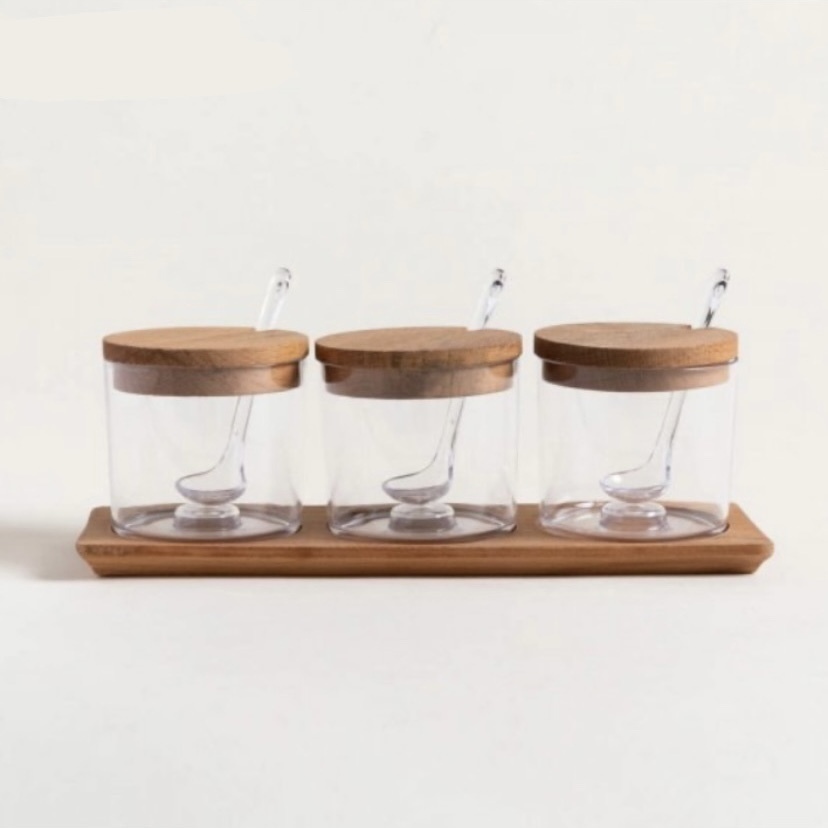 Recipientes contenedores realizados en acrílico con tapas de madera y cucharitas acrílicas, sobre bandeja de madera.
